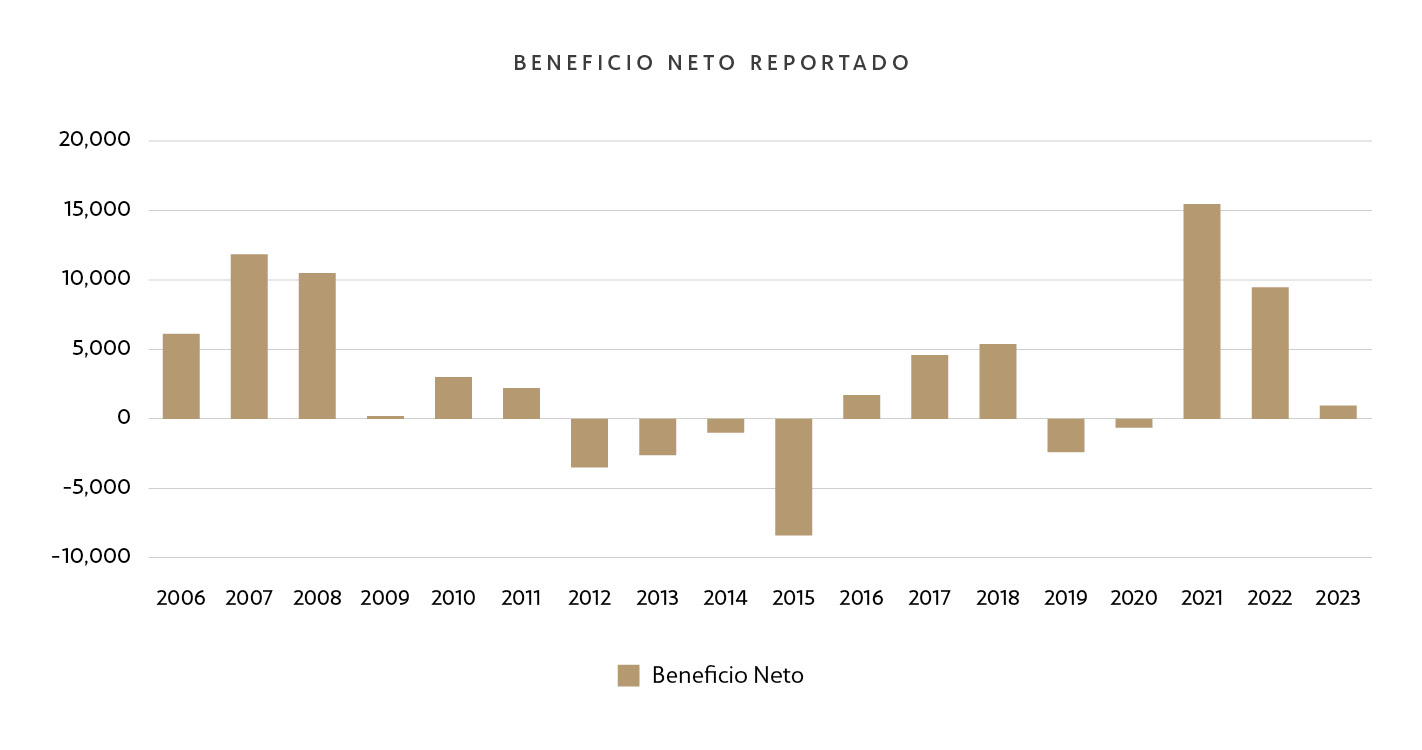 Como se puede comprobar, el beneficio neto de ArcelorMIttal en 2023 fue de 1.022 millones de dólares, mientras que en 2021 alcanzó 15.565 millones de dólares. En el gráfico siguiente se puede ver la evolución del beneficio neto reportado desde 2006 extraído de sus memorias anuales.