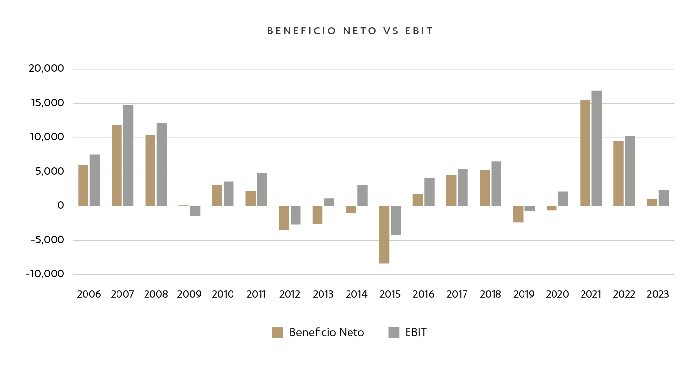 Como el EBIT no considera los gastos financieros, fiscales e intereses minoritarios, suele ser superior al Beneficio Neto. En la imagen anterior se puede ver que ArcelorMittal obtuvo un EBIT de 2.340 millones de dólares en 2023 frente a un beneficio neto de 1.022 millones de dólares.