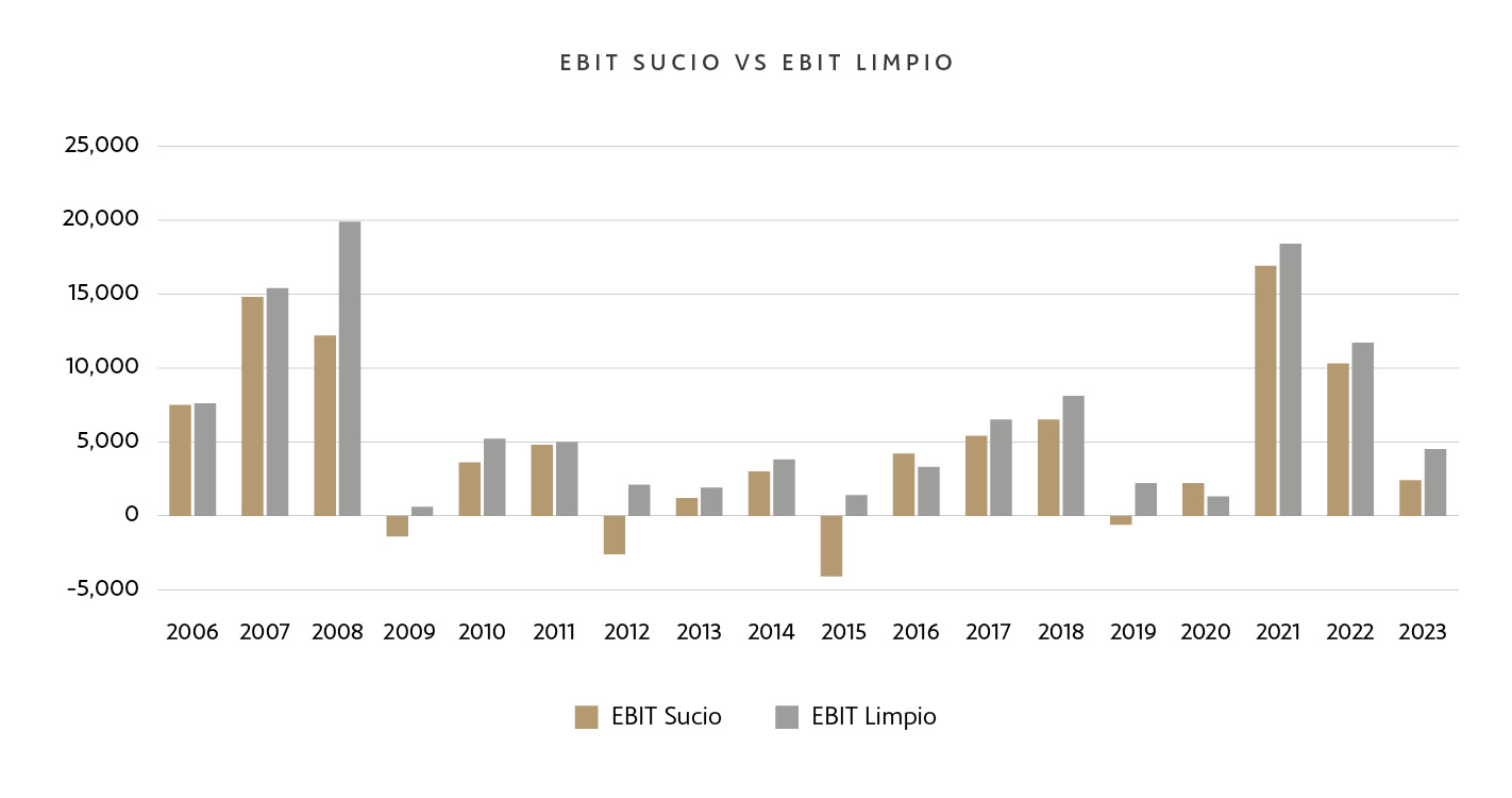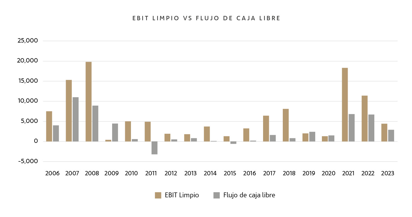 Lo que nos interesa en este caso es partir de una estimación de EBIT Limpio y ajustar todos los elementos non-cash incluidos en él. A continuación, se debe considerar la inversión neta en activos circulantes y, por último, las inversiones en sus activos fijos. De esta forma, se obtiene una medida de flujo de caja libre sin elementos extraordinarios que lo distorsionen. A continuación, puede observarse la comparativa entre el EBIT Limpio y el flujo de cala libre desde 2006 a 2023 para el gigante acerero, realizando los ajustes mencionados con datos de las memorias de la compañía.