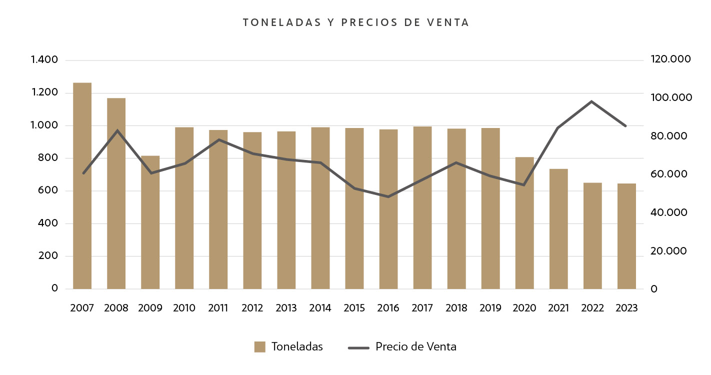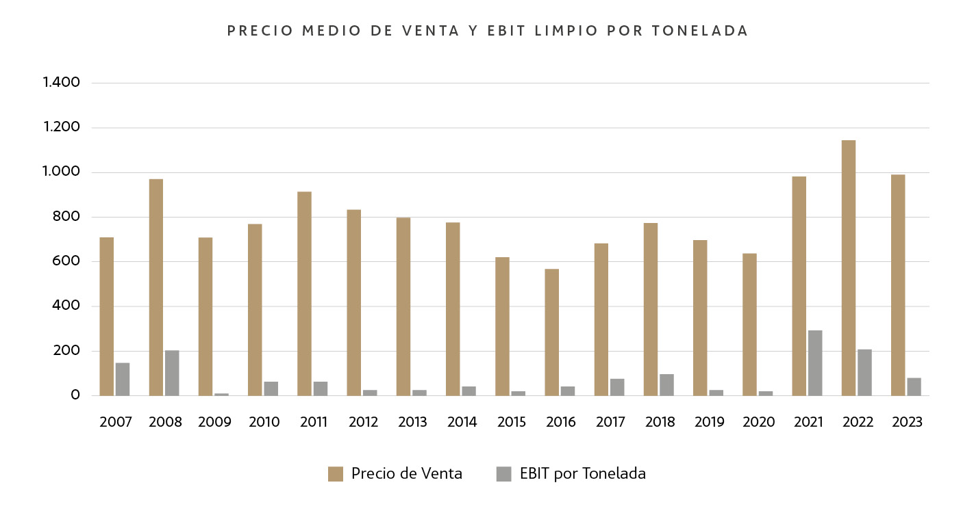 La variación anual entre las toneladas totales y el precio medio de venta provocan fuertes oscilaciones en otra de las métricas esenciales de su negocio: el EBIT por tonelada.