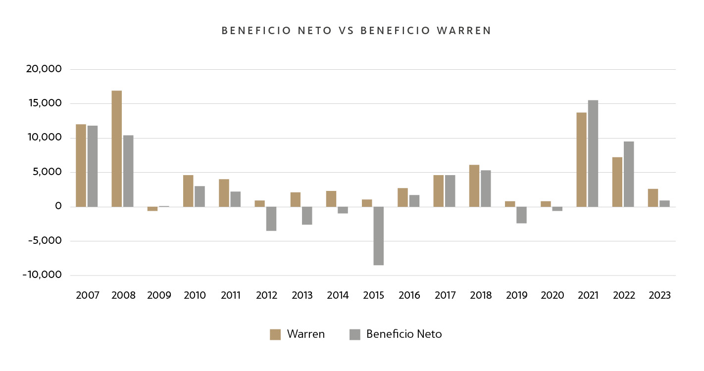 Como Berkshire no suele invertir en empresas muy endeudadas, el beneficio neto de sus compañías no suele contener muchas partidas de gasto financiero y, en consecuencia, no distan en exceso de los beneficios operativos. Por otro lado, es de suponer que el segundo de los ajustes que propone trata de transformar los beneficios operativos en una medida en cash y que excluya elementos extraordinarios como los impairments. Por último, es necesario hacer una estimación de las inversiones en mantenimiento ya que el estado de flujo de caja reporta las inversiones totales –que incluyen las de los proyectos de crecimiento–.