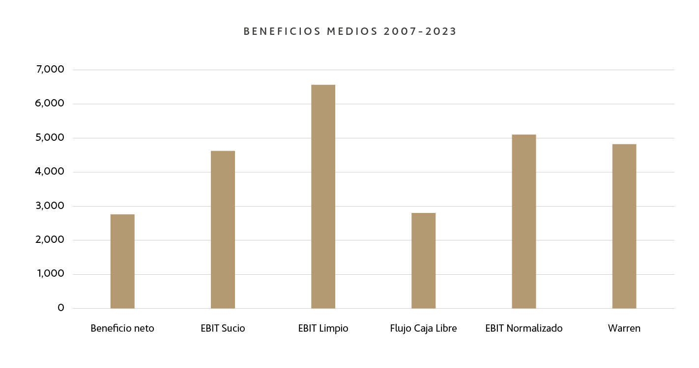 Como hemos visto en este artículo, estimar los beneficios que genera un negocio es una labor compleja no exenta de polémica. Como se puede ver en el siguiente gráfico, la oscilación entre las diferentes medidas de beneficios es un 136% entre la más alta –la que supone el EBIT Limpio– y la más baja –la representada por el beneficio neto contable publicado–.