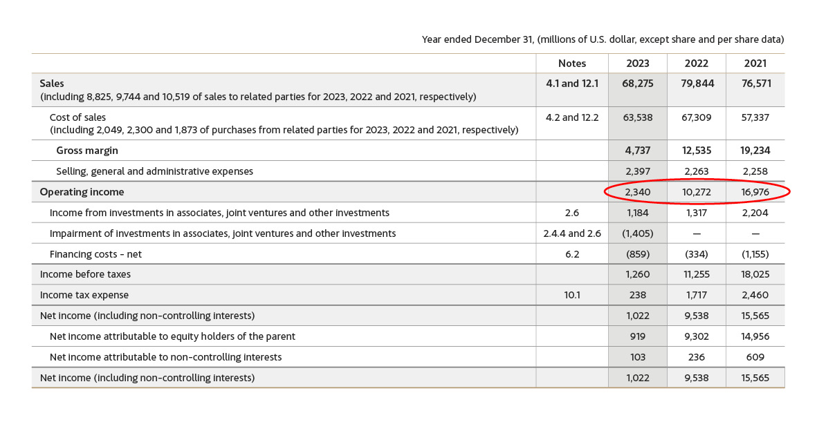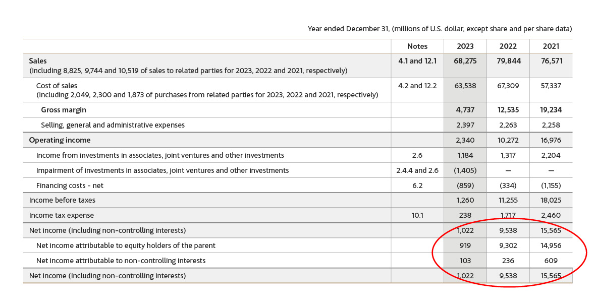 Para conocer los beneficios contables de una empresa, debemos consultar la Cuenta de Pérdidas y Ganancias que se reporta cada año en la memoria anual. En la siguiente imagen se puede ver el beneficio neto de ArcelorMittal*, publicado en su memoria de 2023.