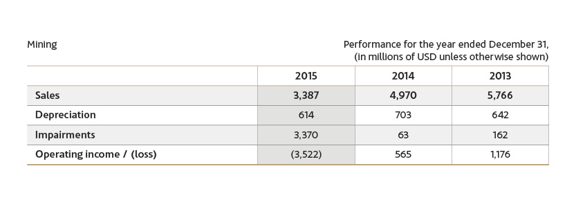 En el caso de ArcelorMIttal, por ejemplo, en el año 2015 tuvo que hacer un fuerte ajuste del valor de sus activos debido a la caída del negocio. Este ajuste implica un gasto extraordinario que se denomina “impairment” y que se suele reportar junto a la depreciación y amortización. En total, durante aquel ejercicio, el gigante acerero recortó el valor de sus activos por un montante total de 4.161 millones de dólares. Como se puede ver en la siguiente imagen tomada de su memoria anual, sus activos mineros supusieron 3.370 millones de dólares de ajuste.