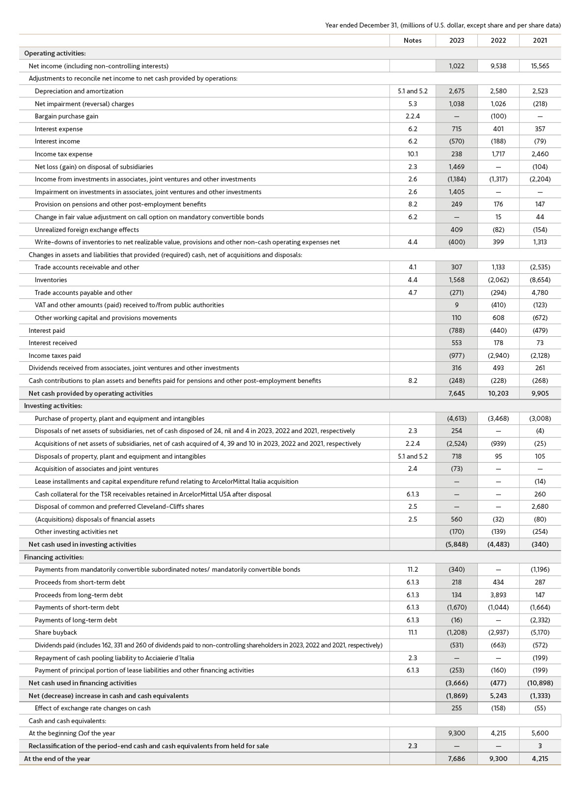 En la siguiente imagen se puede ver un extracto de los estados de cash flow de ArcelorMIttal publicados en su memoria del ejercicio 2023.