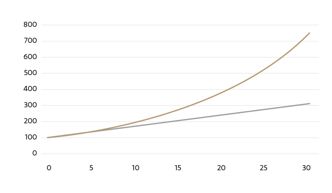 El inversor de la curva dorada realiza la misma inversión, pero con una diferencia: en vez de guardar los 7€ de beneficios anuales en su cuenta corriente, los reinvierte. Esta reinversión hace que, después del primer año, su base de capital no sea de 100€ sino de 107€ y, en consecuencia, la rentabilidad del 7% en el segundo año ya no genera 7€ de beneficio, sino 7,5€. Estas ganancias, a su vez, son reinvertidas, por lo que la base de capital del año dos será de 114,5€ que, con una rentabilidad del 7%, producirá 8€ de beneficios el tercer año. La reinversión es repetida periódicamente hasta que después de 29 ejercicios la base de capital es de 711,4€ y una rentabilidad del 7% genera 49,8€ de beneficios al final del periodo de análisis. Por tanto, tras 30 años, el capital total ascenderá a 761,2€; es decir, habrá acumulado 661,2€ en concepto de beneficios frente a los 210€ del otro inversor.