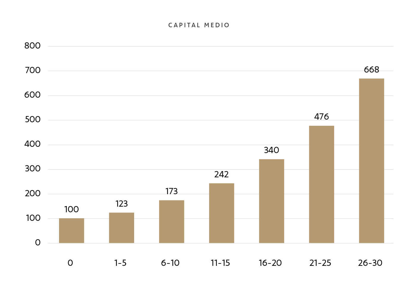 Fíjese de nuevo en el gráfico anterior y observe la curva gris. Muestra la evolución de un capital que cada año genera 7€ de beneficios que el inversor va guardando en su cuenta corriente hasta que, al final del periodo, acumula un beneficio de 210€ y un capital total de 310€.