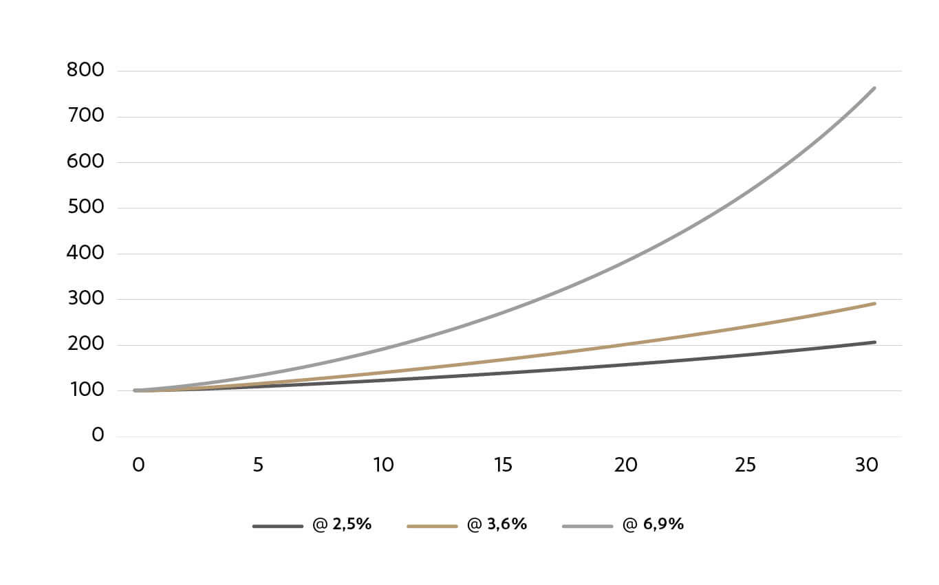 Estudiemos el comportamiento de tres carteras de 100€ a 30 años que reinvierten anualmente los beneficios generados. Utilizando los datos históricos del profesor Jeremy Siegel2, una cartera invierte en un índice que replica el comportamiento de la renta variable y que genera una rentabilidad media a largo plazo del 6,9% anual. Otra invierte en una cartera bonos a largo plazo y genera un 3,6% anual. Y, finalmente, la tercera invierte en letras del Tesoro, con un retorno del 2,5% anual.