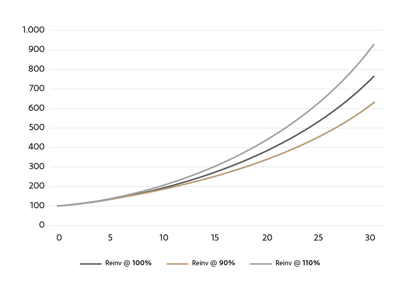 La siguiente gráfica muestra la evolución de tres inversiones de 100€ con un plazo de 30 años y una rentabilidad anual del 7%. La diferencia entre ellas está en la actitud del inversor. En el primer caso –curva negra–, decide reinvertir todos los beneficios generados; en el segundo –curva dorada–, opta por invertir un solo un 90% del beneficio producido cada año y en el tercero –curva gris–, además de reinvertir el 100% de las ganancias, realiza aportaciones adicionales por valor del 10% de los beneficios. Es decir, tres casos en los que se reinvierte un 100%, un 90% y un 110% de los beneficios anuales, respectivamente.