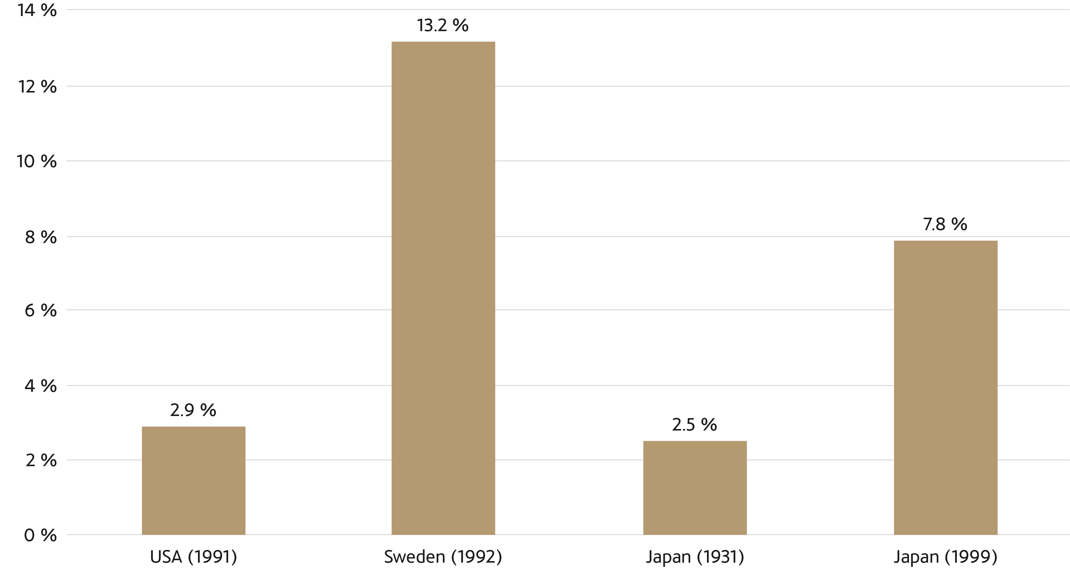Las imágenes a continuación presentan el impacto de la burbuja en los resultados de los bancos y en la evolución del crédito. En la primera, se muestran los créditos impagados como porcentaje del PIB en varias crisis bancarias del siglo XX. En la segunda, se aprecia el duro descenso en el crecimiento del crédito tras el pinchazo de las burbujas. Un descenso que tarda mucho tiempo en recuperarse y lleva a las economías a un período de bajo crecimiento y deflación.