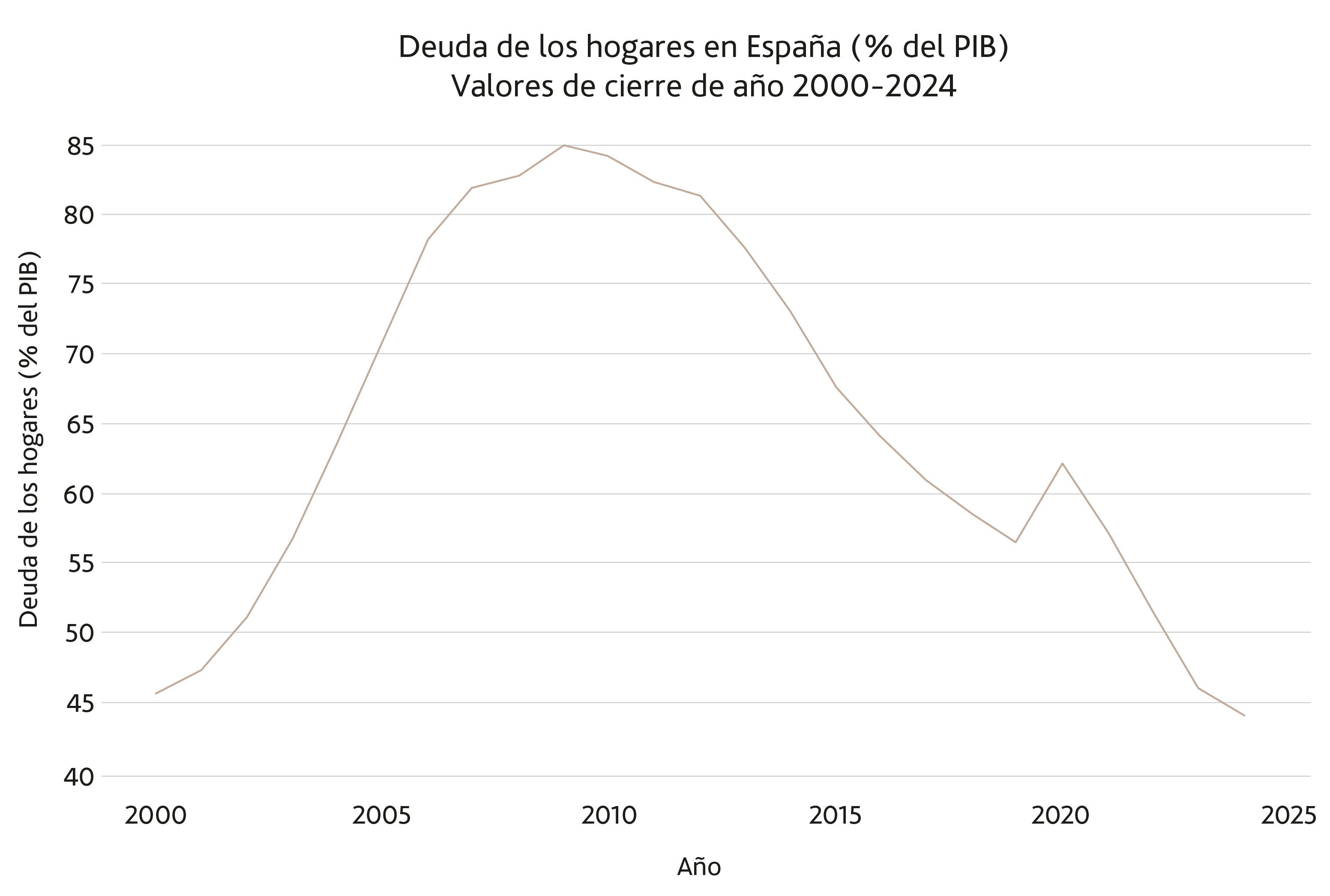 El siguiente gráfico representa el ciclo de crédito en España durante los últimos 25 años. En él se observa el cambio de comportamiento mencionado durante la crisis de balance iniciada tras la burbuja inmobiliaria. A pesar de los bajos tipos de interés de la última década, el volumen de endeudamiento de los hogares no ha dejado de caer.