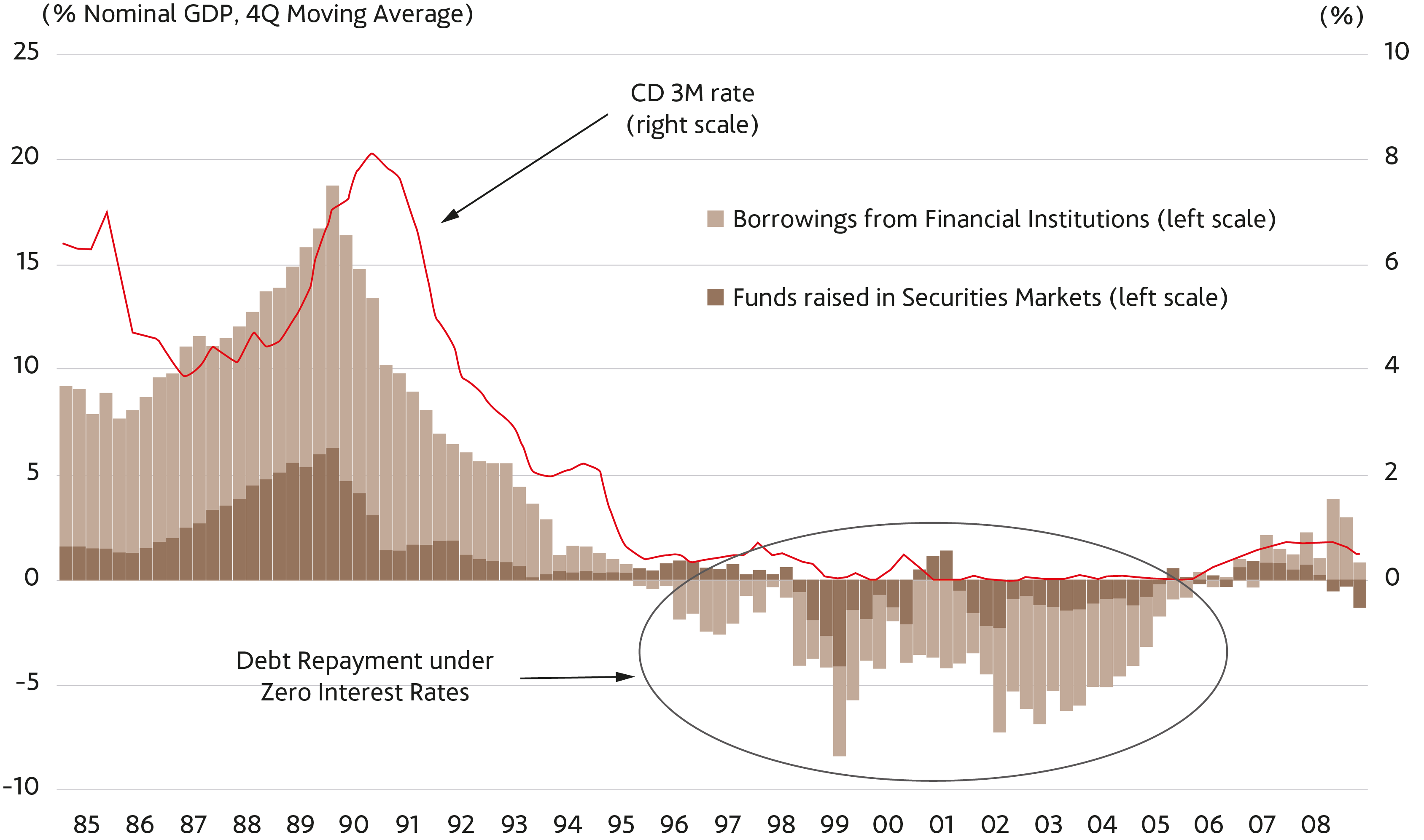 Hay tres razones por las que este tipo de crisis es especial. La primera es que, debido al cambio de comportamiento que acabamos de señalar, la política monetaria convencional deja de funcionar. Los tipos bajos –incluso los tipos al cero– no son capaces de estimular la demanda de crédito. Al contrario, se aprecia un recorte masivo del saldo vivo de las deudas con tipos en niveles de mínimos históricos. Un comportamiento que, bajo el modelo neoclásico, se tilda de completamente irracional.