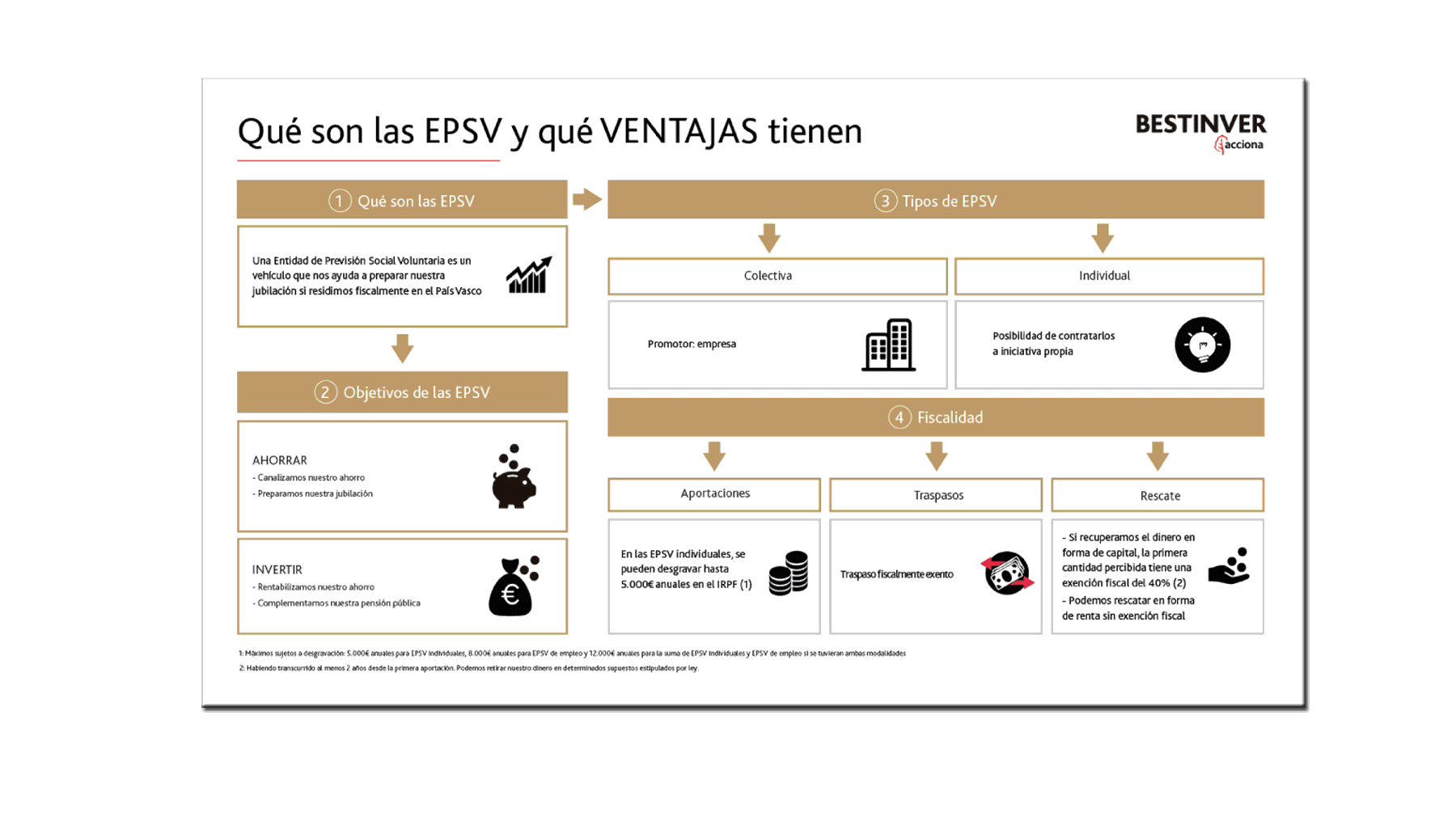 Ante los retos que se plantean para el sistema público de pensiones, los ciudadanos tienen a su disposición fórmulas de ahorro que en el futuro les puedan ayudar a complementar la pensión pública. En el País Vasco, además de los planes de pensiones, existe otro vehículo con características y ventajas similares: las Entidades de Previsión Social Voluntaria (EPSV).